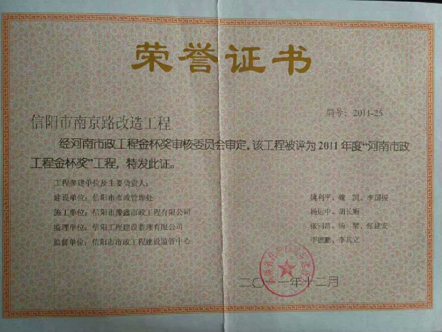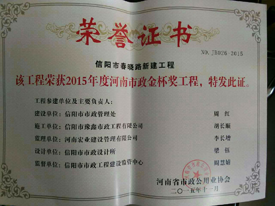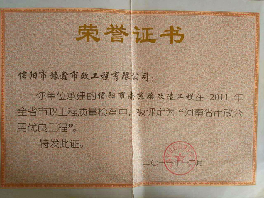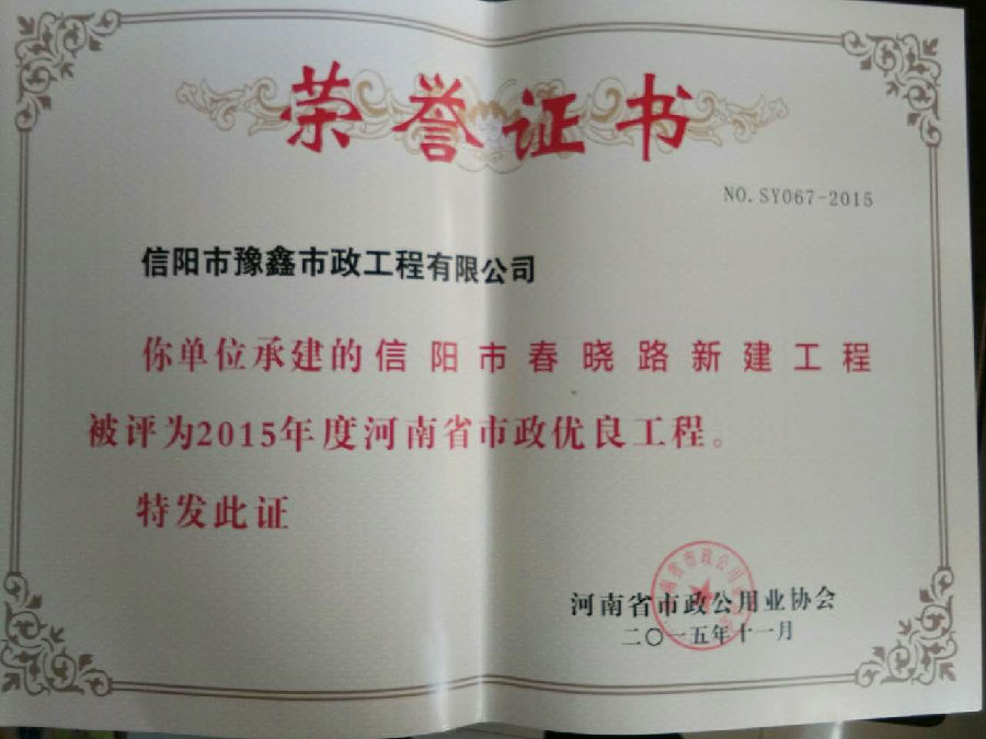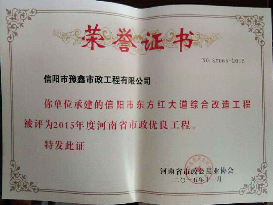 好風(fēng)憑借力,送我上青云。近年來,公司積極參與城市市政基礎(chǔ)設(shè)施建設(shè)施工,積極參與市場競爭,先后承擔(dān)施工了市政府重點工程南京路道路改造工程、春曉路道路改造工程,東方紅大道道路改造工程、龍江東路新建工程等重點民生工程,其中南京路道路改造工程被省建設(shè)廳評為“中州杯”, 春曉路和東方紅大道道路改造工程被省建設(shè)廳評為“省優(yōu)工程”,成為城區(qū)一道道亮麗的風(fēng)景線。參與施工了市典范小區(qū)“臺北城上城”、“恒大名都”以及師范學(xué)院、職業(yè)技術(shù)學(xué)院、交警支隊和軍區(qū)道路工程,參與施工了雞公山管理區(qū)、南灣管理區(qū)、明港鎮(zhèn)和羅山縣等部分道路小區(qū)工程施工,累計大小各類施工工程三百余項,企業(yè)影響力不斷擴大、輻射力不斷增強,市場份額不斷提高,企業(yè)信譽不斷彰顯,為信陽城市建設(shè)做出了積極貢獻,為企業(yè)的可持續(xù)發(fā)展插上了騰飛的翅膀。
